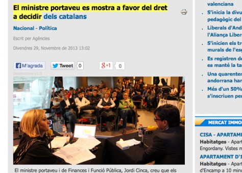 Tot seguit vam voler escatir quina referència havia fet la ràdio i televisió públiques d'Andorra, Andorra Difusió, a les paraules de Cinca sobre el dret de decidir. La televisió té ara una notícia del divendres 29 de novembre amb unes declaracions del ministre portaveu sobre l'acord entre el comú de la Maçana i la banca, enregistrades per ells després de l'entrevista amb Terribas. El titular és aquest: 'Acord entre la Massana i els bancs pel deute de l'EMAP'. No s'hi fa referència a les declaracions sobre el dret de decidir. En una primera versió de la notícia sí que se'n parlava, tant en el text com en el vídeo, dient, al final de la informació, això: 'Jordi Cinca ha fet aquestes declaracions després de la intervenció al "Matí" de Catalunya Ràdio. Durant el programa Cinca s'ha mostrat a favor del dret a decidir dels catalans, tot i que no s'ha volgut pronunciar sobre el fons de la qüestió.
