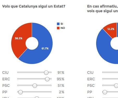 L'eina parteix d'una possibilitat raonable, que per exemple adjudica en la primera pregunta un nombre de vots gairebé mai unànime entre els diversos partits, tots els parlamentaris més Solidaritat, Plataforma per Catalunya i d'altres. Els usuaris poden aleshores moure aquests tants per cent i imaginar així els escenaris possibles del vot definitiu.