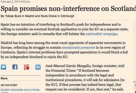 'Espanya no té cap intenció d'interferir en la determinació d'Escòcia cap a la independència i està disposada a considerar una eventual petició escocesa per entrar a la UE com a estat independent', assegura el Financial Times. L'article del rotatiu avisa que els comentaris de Margallo 'enfortiran la campanya nacionalista' a Escòcia perquè Madrid 'ha estat dels principals opositors als moviments separatistes a Europa" i intenta "frenar les pressions secessionistes a la regió de Catalunya'.