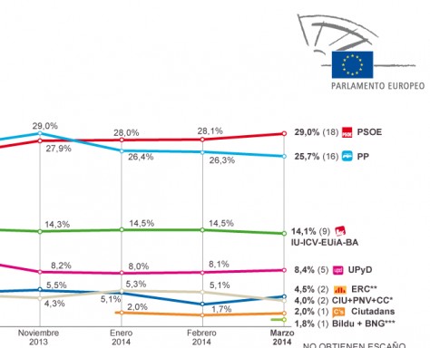 Per la seva banda, IU-ICV-EUiA-BA aconseguiria nou eurodiputats amb un 14,1% dels vots. El PSOE superaria el PP amb 18 escons i 16, respectivament (29%, el PSOE; 25,7%, el PP). UPyD entraria a la cambra europea amb cinc eurodiputats (8,4% dels vots) i Ciutadans entraria amb un diputat (2% de vots). Finalment, també hi hauria un representant de la coalició Bildu-BNG amb un 1,8% dels vots.