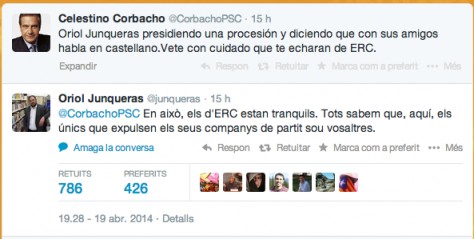 El president d'Esquerra, Oriol Junqueras, va deixar mut ahir el diputat del PSC Celestino Corbacho, que en un missatge publicat a Twitter va ironitzar sobre el fet que Junqueras hagués presidit la processó de Sant Vicenç dels Horts, d'on és batlle, i hagués dit que parlava en castellà amb els seus amics, en referència a un article publicat aquesta setmana en què defensava de nou l'oficialitat del castellà. 'Vés amb compte que et faran fora d'ERC', va escriure Corbacho. La resposta de Junqueras va arribar al cap de pocs minuts en forma de plantofada, i va recordar a Corbacho que els únics que havien expulsat companys del partit eren els socialistes catalans (per l'expulsió de Fabián Mohedano de la direcció) i que a ERC estaven tranquils. El diputat del PSC ja no va tornar a respondre.