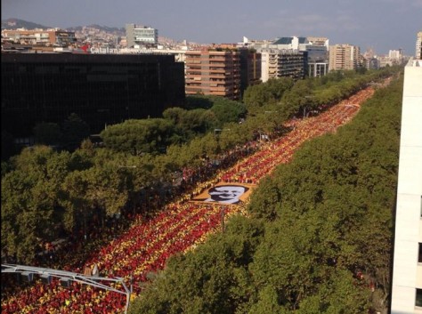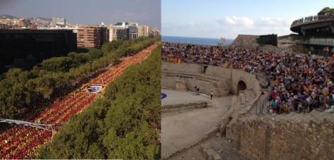 Una de les imatges més impressionants d'aquesta Diada és la comparació entre dues fotografies: la de la V multitudinària de la Diagonal i la Gran Via de Barcelona, on s'han congregat un milió vuit-cents mil manifestants, segons la Guàrdia Urbana, i la fotografia de la concentració unionista que ha convocat Societat Civil Catalana a l'amfiteatre romà de Tarragona, on hi han anat uns quants centenars de manifestants, com ara dirigents i militants de PP, Ciutadans, socialistes (entre els quals Carme Chacón) i organitzacions d'ultradreta. Us oferim la comparació entre totes dues imatges.
