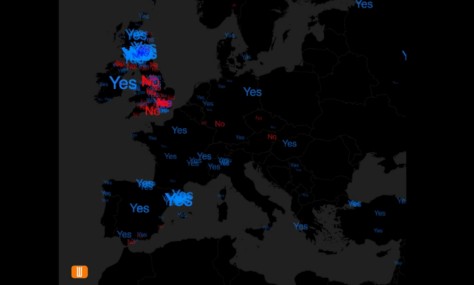 La web Trendsmap.com mostra en un mapa quina intensitat han tingut els missatges favorables al sí i al no al llarg del matí; tant a Escòcia, com al Regne Unit i a tot arreu del món. I és ben curiós de fer un cop d'ull a quina estat l'evolució del sí i el no a casa nostra.
